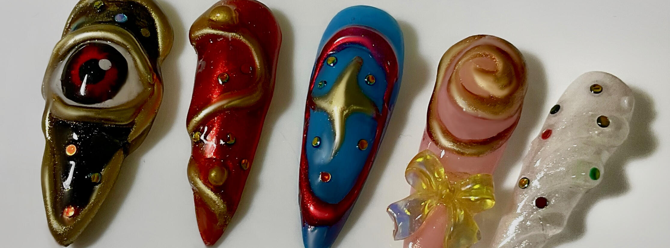 Hi! i’m Ysa, I’m an art student who loves to make cute and funky nails. NS studio offers press-on nails which are reusable, portable, and artistic! Pre-made designs are provided, but custom ones can be made upon order as well :)